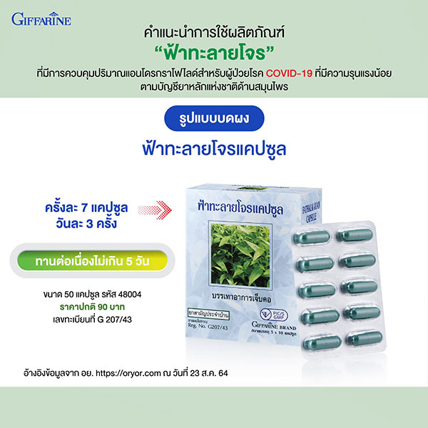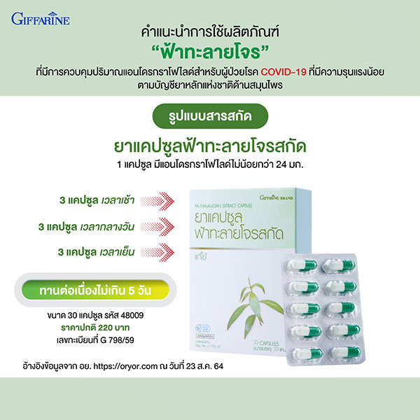 "ข้อแนะนำในการรับประทานเพื่อรักษา COVID-19 / หรือ สงสัยว่าติดเชื้อ ควรทานแบบแคปซูล/แบบเม็ด  โดย จะต้องรับประทาน ให้ได้สารสำคัญ Andrographolide 180 มก. หรือประมาณ 3 เม็ด แบ่งเป็นเป็น 3 เวลาก่อนอาหาร และไม่ควรทานติดต่อกันเกิน 5 วันต่อสัปดาห์ และไม่ควรทานต่อเนื่องเกิน 3 เดือน "