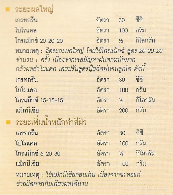 เนื่องจากได้เยอะกว่าทุกปี และส่วนใหญ่ได้ผลโตขนาด 34 เยอะมากค่ะ จึงคิดว่าจะใช้ปุ๋ยกิฟฟารีนเต็มสูตรทุกปี ส่วนวิธีการใช้มีดังนี้
