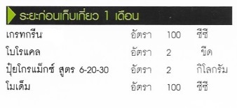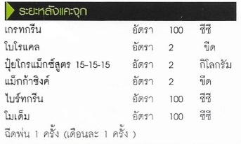แล้วนำไปปลูกจนหน่อเริ่มรัดแล้วประมาณ 1 เดือน เริ่มทำการฉีดพ่นด้วยปุ๋ยกิฟฟารีนตามระยะ เดือนละ 1 ครั้ง ต่อน้ำ 400 ลิตร ดังนี้