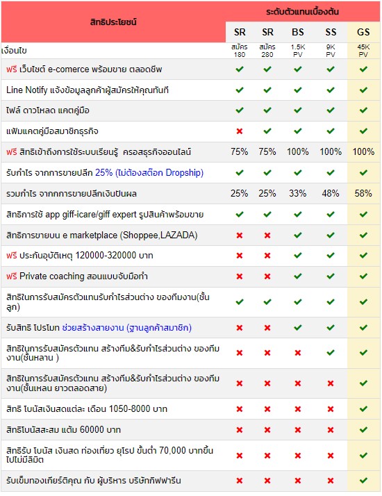 สิทธิประโยชน์ของสมาชิกแต่ละระดับ (ไม่ต้องสต๊อก ระดับตัวแทนขึ้นตามคะแนนรวมของยอดกลุ่ม)