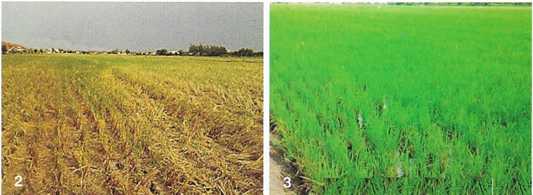 1-2 สภาพพื้นที่ข้าวตอสองหลังจากมีการแตกใบอ่อนแล้วจึงเริ่มใช้  เจอร์มิเนท 25-30 ซีซี ต่อน้ำ 25 ลิตร เพื่อเร่งการแตกยอดและใบ