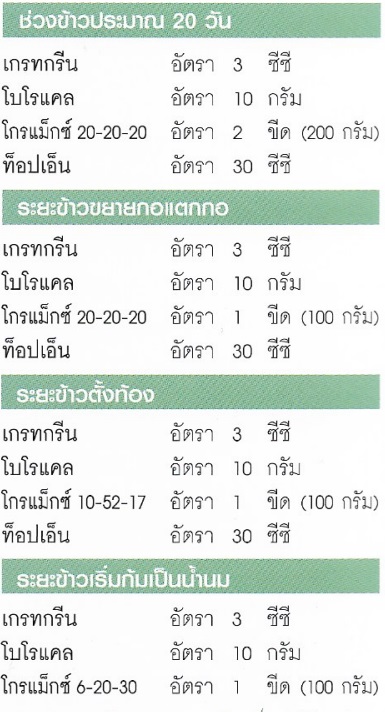 3-4 หลังจากมีการใช้เจอร์มิเนทแล้วใช้ปุ๋ยบำรุงต้น โกรแม็กซ์ 20-20-20 ต้นข้าวประมาณ 25 วัน ข้าวจะเขียวสมบูรณ์ขึ้น