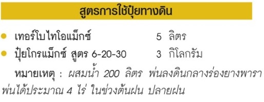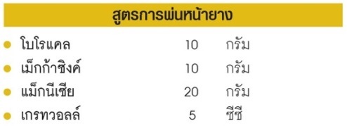 หมายเหตุ: ผสมน้ำ 20 ลิตร พ่นหน้ายางเดือนละครั้ง หรือ ผสมกับดินทาหน้ายาง สามารถใช้ยาเชื้อรา เมทาแลคซิลผสมพ่นหรือทาหน้ายางได้ด้วย