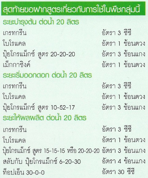 ปุ๋ยโกรแม็กซ์ 15-15-15 ช่วยในการแตกยอดบำรุงตันและใบ ปุ๋ยโกรแม็กซ์ 6-20-30 และ10-52-17 ปุ๋ยเร่งดอก พืชในกลุ่มนี้ในช่วงให้ผลผลิตควรสลับ ปุ๋ยโกรแม็กซ์ 15-15-15 และปุ๋ยโกรแม็กซ์ 6-20-30 อย่างเหมาะสม